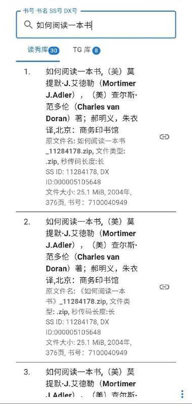 网址只有一个搜索框,搜索你想要书籍的书号、书名、SS号、DX号即可,搜索到的书籍会以百度网盘秒传链接和转存链接列出,并且有Telegram里的书籍资源,点击跳转到电报资源即可下载。